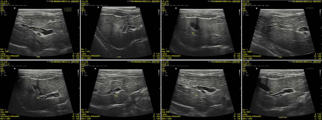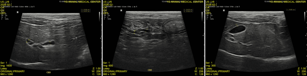 현재는 정기적인 검사와 내복약 복용을 통해 지속적으로 관리하고 있으며, 최근 추적 초음파에서는 담관 내 슬러지가 사라진 상태를 확인하였고 담낭 내 슬러지도 이전보다 개선된 상태입니다. 또한 총담관(CBD) 확장 역시 호전된 상태로 유지되고 있어 안정적으로 관리 중입니다. 보호자님께서도 식욕, 구토 여부, 전반적인 활력 변화를 꾸준히 관찰하며 치료에 적극적으로 협조해주신 덕분에 좋은 경과를 보이고 있습니다.