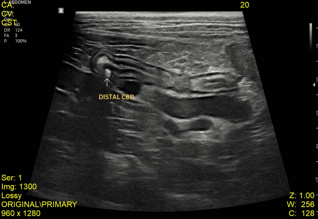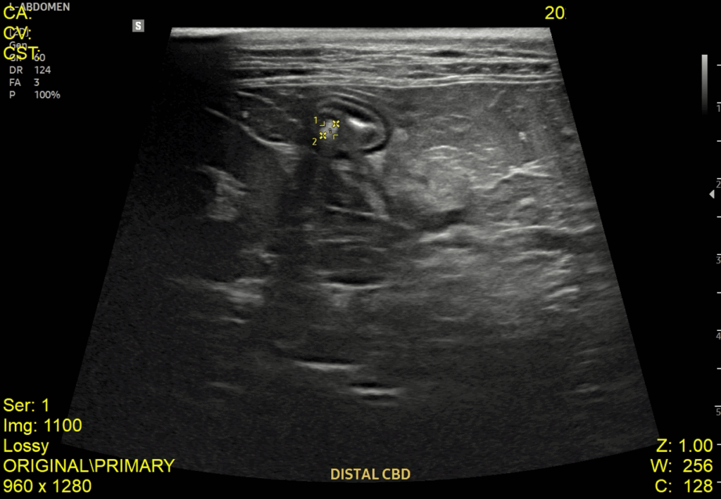 이어서 진행한 복부 초음파 검사에서는 췌장염 소견과 함께 위벽 및 일부 장 근층 비후가 관찰되었고, 담낭관(Cystic duct)과 총담관(CBD)이 심하게 확장되어 있으며 내강 내 슬러지가 확인되었습니다. 또한 담낭 내에는 중등도의 슬러지와 담석이 있었고, 간 내 담도 결석과 전반적인 간 에코 증가도 함께 확인되었습니다.